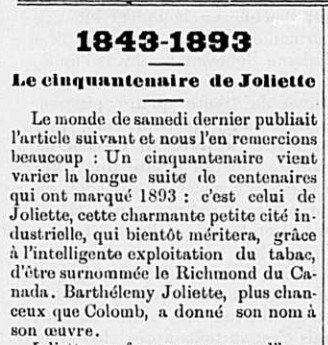 En 1893 le journal de Joliette a publié un article célébrant le cinquantenaire de la ville; c’est spécial puisque la ville a été fondée en 1823. Cette charmante petite cité industrielle, qui bientôt méritera, grâce à l’intelligente exploitation du tabac, d’être surnommée le Richmond du Canada.