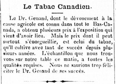 Nous apprenons que M. le Dr. Genand de Saint-Jacques, envoie une forte quantité de tabac a nos zouaves… M. le chanoine Moreau se chargerait avec plaisir de tout le tabac qu’on voudrait lui confier et le transporterait a Rome sans frais ni dépenses (Le Journal de Québec, 23 septembre 1869). En 1887 à l’exposition provinciale de Québec le docteur Genand présentait encore ses produits du tabac (Le Courrier du Canada, 9 septembre 1887).