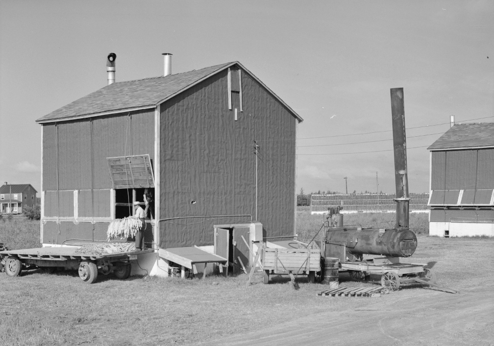 La culture du tabac est particulière dans nos régions, à cause du gel fréquent en début de saison et à la fin. La graine est mise en terre dans une couche, le jeune plant est repiqué aux champs lorsque tout risque de gel est passé. Sarclages fréquents, surveillance de la présence du ver à tabac qui bouffe les feuilles (toxiques). J’imagine que l’habitant les enlevait à la main. Oncle André devait pulvériser des poisons. Si les vaches mangeaient du tabac, elles pouvaient en mourir. Lors de la rentrée du tabac (en lattes) dans le séchoir, il fallait laisser les portes ouvertes pour éviter que le tabac chauffe. C’était une odeur très agréable pour moi! Les vaches d’oncle André pacageaient près de son séchoir et il devait poser de la broche piquante (barbelée) pour les empêcher d’y entrer… Les séchoirs à tabac cigarettes étaient assez différents de ceux du tabac à pipe qui servaient aussi de remise à machineries.