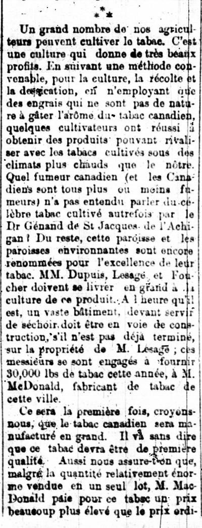 En 1881 MM. Dupuis, Lesage et Foucher ont commencé à se livrer en grand à la culture du tabac. Un vaste séchoir a été construit et ils s’engageaient à livrer 30.000 livres de tabac à M. MacDonald fabricant de tabac de Montréal.