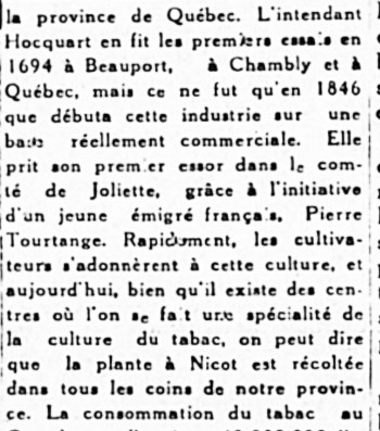 La culture du tabac et sa préparation ont été des industries particulièrement importantes pour la région de Lanaudière. Ce ne fut qu’en 1846 que débuta cette industrie sur une base réellement commerciale. Elle prit son premier essor dans le comté de Joliette grâce à l’initiative d’un jeune émigré français, Pierre Tourtange… On ne trouve pas d’autre information à son sujet dans les archives en ligne.
