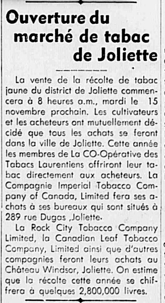 La vente de la récolte de 1953 du tabac jaune du district de Joliette ouvrira à 8 h. a.m„ le mardi, 17 novembre. Les cultivateurs et les acheteurs ont mutuellement décidé que tous les achats se feront dans la ville de Joliette… La récolte cette année est estimée à environ 5,000,000 lb.