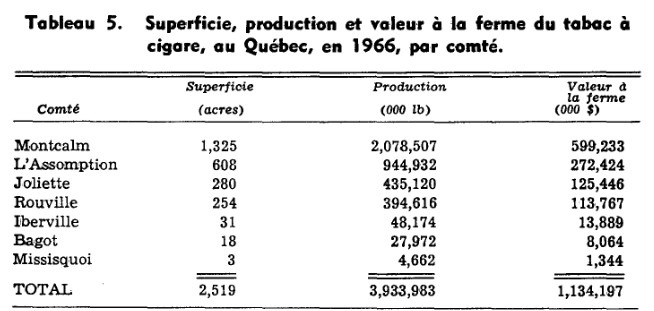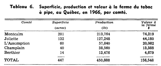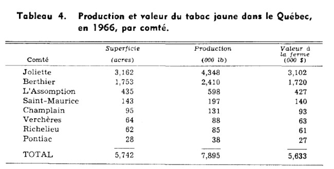 Des statistiques produites pour le gouvernement du Québec en 1966 confirment l’importance de la région de Lanaudière dans la culture du tabac. Presque toute la production du tabac jaune à cigarettes venait des comtés de Joliette, Berthier et L’Assomption.