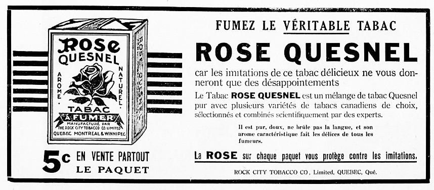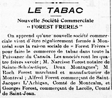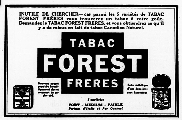 Quelques compagnies québécoises commercialisaient le tabac local, principalement Forest Frères Limitée de Montréal, la Rock City Tobacco Company fondée en 1899 par les frères Drouin et B. Houde & cie créée par Barthélemi Houde en 1841 à Québec. Les frères Forest sont nés à Saint-Jacques de l’Achigan. En 1893 Roch a déménagé à Montréal et s’est établi comme acheteur de tabac canadien; il a fondé une société commerciale avec ses frères en 1906.