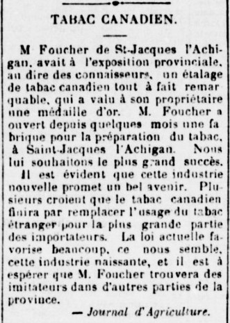 En 1882 la Gazette de Joliette annonçait que M. Foucher avait construit une fabrique pour la préparation du tabac à St-Jacques de l’Achigan.