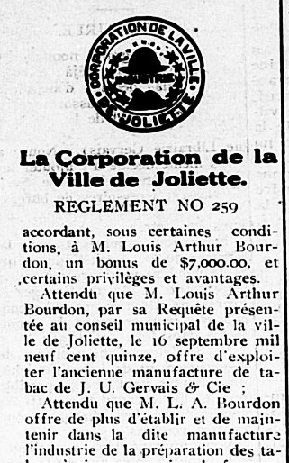 En 1915 M. Louis Arthur Bourdon manufacturier de cigares de L’Épiphanie a acheté l’ancienne manufacture Gervais, il a obtenu un bonus de $7.000 et certains privilèges de la ville de Joliette. Un contribuable anonyme a protesté le même jour dans L’Action Populaire qu’il y avait déjà un manufacturier de cigares dans la ville et que c’était de la concurrence déloyale.