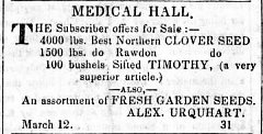 En 1851 John Jeffries de Rawdon recevait une médaille du Prince Albert lors de la 1ère exposition industrielle pour un specimen de graine de trèfle rouge, Rawdon red clover. Dans les journaux anciens on trouve une multitude d’annonces comme celle-ci de l’apothicaire Devins & Bolton. Le trèfle rouge a été une des richesses du patrimoine de Rawdon pendant tout le XIXème siècle mais en faisant une recherche à ce sujet sur Google je n’ai rien trouvé, un autre patrimoine disparu.