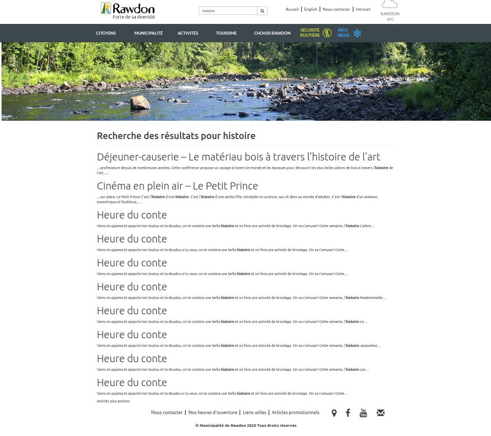 Si on fait la recherche « histoire » sur le site internet de Rawdon voilà le résultat. Il n’y a pas un mot sur l’histoire de Rawdon sur leur site internet. Mais ils ont certainement un service de la culture qui coûte cher.